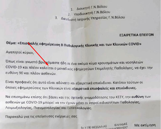 Aυτό αποδεικνύεται από επιστολή που εστάλη προς την διεύθυνση του ΓΝ Βόλου από την 5η Υγειονομική Περιφέρεια Θεσσαλίας.