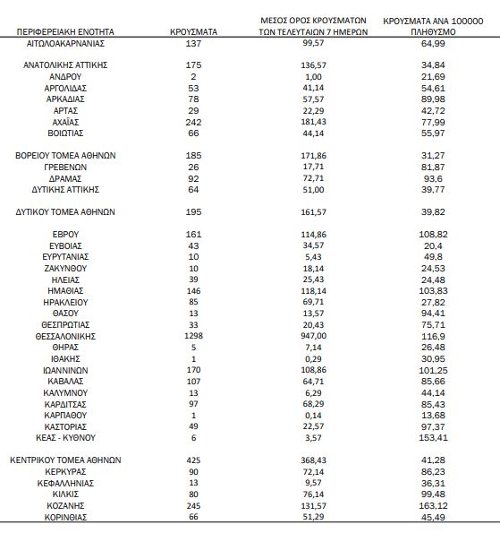 Ο ΕΟΔΥ γνωστοποίησε ακόμη την γεωγραφική κατανομή των κρουσμάτων ανά περιφέρεια με την Αττική να σημειώνει 1455 νέες μολύνσεις.