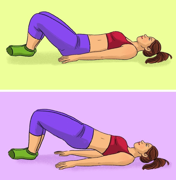 Κατά την εκτέλεση της γέφυρας, θα πρέπει να ασκείτε πίεση στους γλουτούς και τον πυρήνα. Κάνετε 3 επαναλήψεις.
