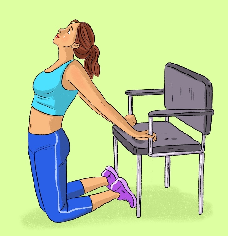 Καθίστε στο πάτωμα μπροστά από μια καρέκλα με την πλάτη προς αυτή, λυγίστε τα γόνατά σας και τοποθετήστε τα χέρια στις λαβές της καρέκλας. Ισιώστε τους ώμους σας και σπρώξτε το στήθος όσο το δυνατόν περισσότερο, κρατώντας το κεφάλι σας πίσω. Μείνετε στη θέση αυτή για 1-2 δευτερόλεπτα και στη συνέχεια επιστρέψτε στην αρχική θέση.