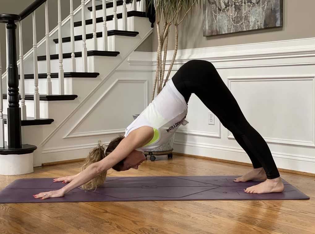 Πίεσε τις φτέρνες σου προς τα κάτω, αλλά όχι απαραίτητα αγγίζοντας το χαλάκι εάν δεν έχεις την ευελιξία. Μια ελαφριά κάμψη στα γόνατα θα σε βοηθήσει.