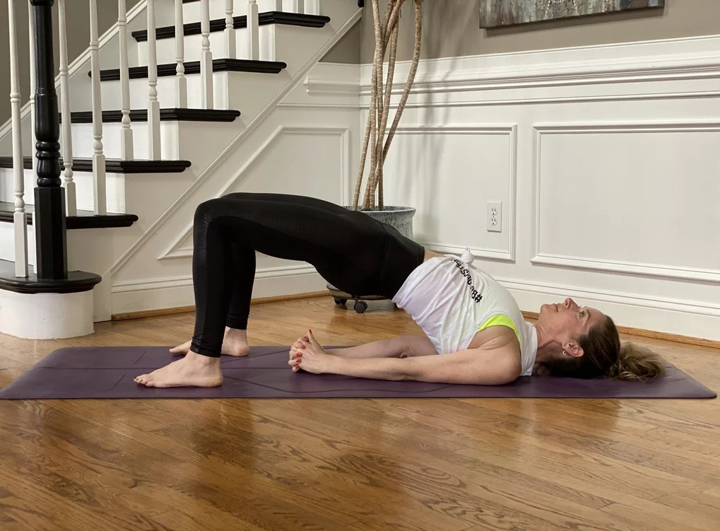 Πίεσε προς τα κάτω τα πόδια και σήκωσε τους γοφούς προς τα πάνω. Καθώς εισπνέεις, επεκτείνεις την αναπνοή στο στήθος σου και καθώς εκπνέεις, πίεσε προς τα κάτω τις φτέρνες και σηκώστε τους γοφούς σου. Μείνε για πέντε γύρους αναπνοής.
