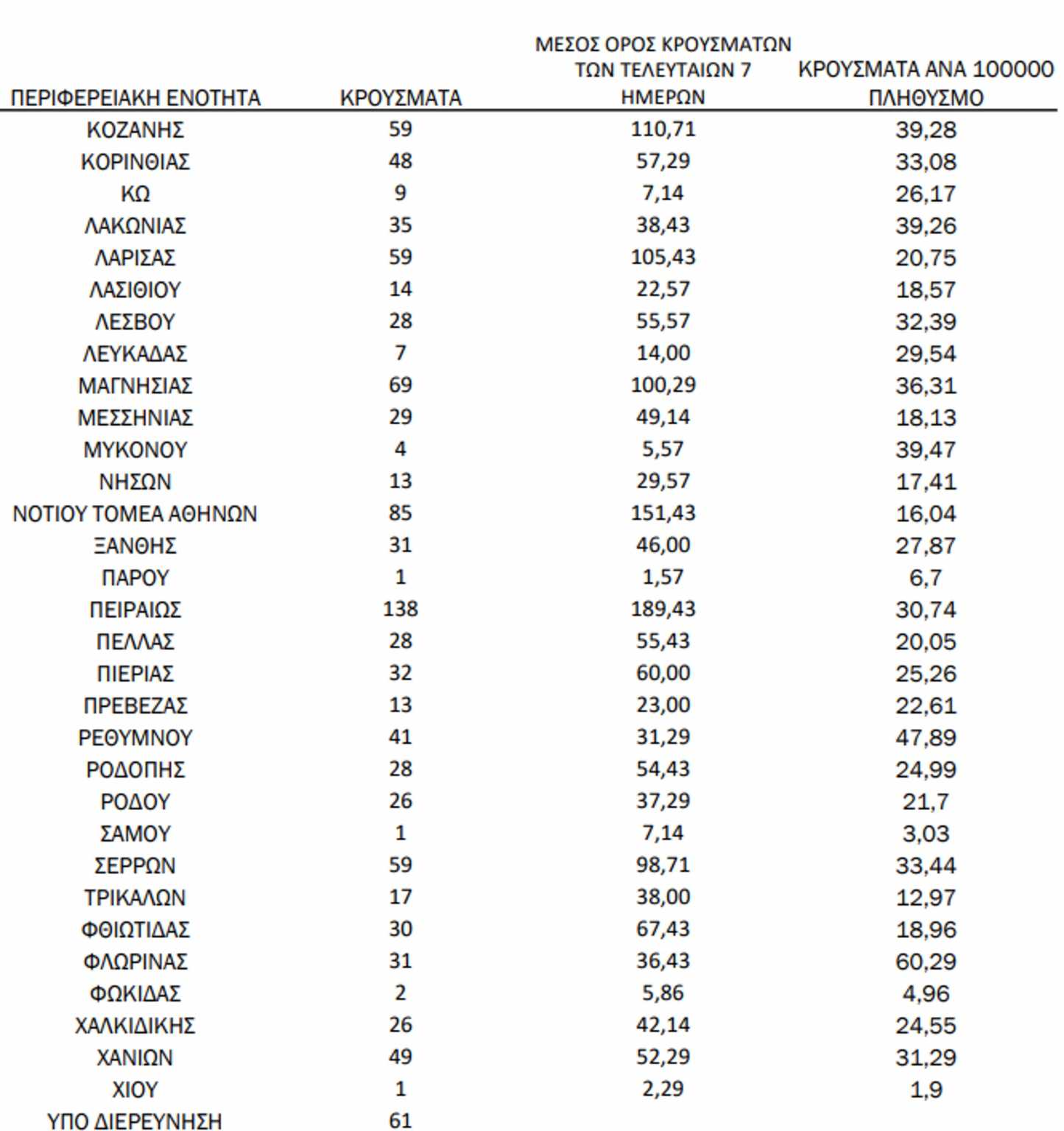 Με βάση τα επιβεβαιωμένα κρούσματα των τελευταίων 7 ημερών, 88 θεωρούνται σχετιζόμενα με ταξίδι από το εξωτερικό και 2.730 είναι σχετιζόμενα με ήδη γνωστό κρούσμα.