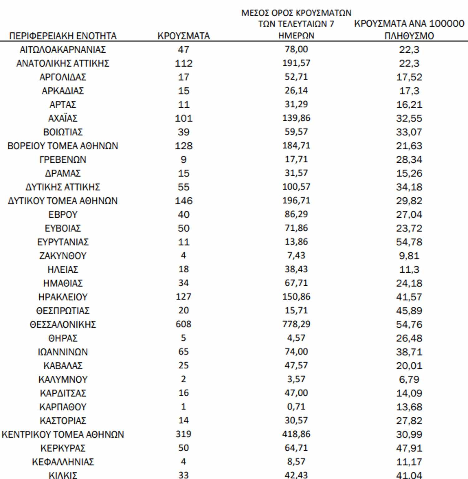 Με βάση τα επιβεβαιωμένα κρούσματα των τελευταίων 7 ημερών, 88 θεωρούνται σχετιζόμενα με ταξίδι από το εξωτερικό και 2.730 είναι σχετιζόμενα με ήδη γνωστό κρούσμα.