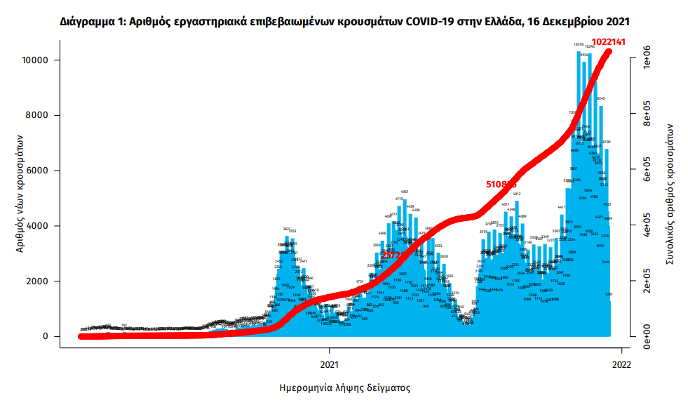Σύμφωνα με τον ΕΟΔΥ τα νέα εργαστηριακά επιβεβαιωμένα κρούσματα της νόσου που καταγράφηκαν τις τελευταίες 24 ώρες είναι 4.696, εκ των οποίων 10 εντοπίστηκαν κατόπιν ελέγχων στις πύλες εισόδου της χώρας. Ο συνολικός αριθμός των κρουσμάτων ανέρχεται σε 1.022.141 (ημερήσια μεταβολή +0.5%), εκ των οποίων 50.5% άνδρες.