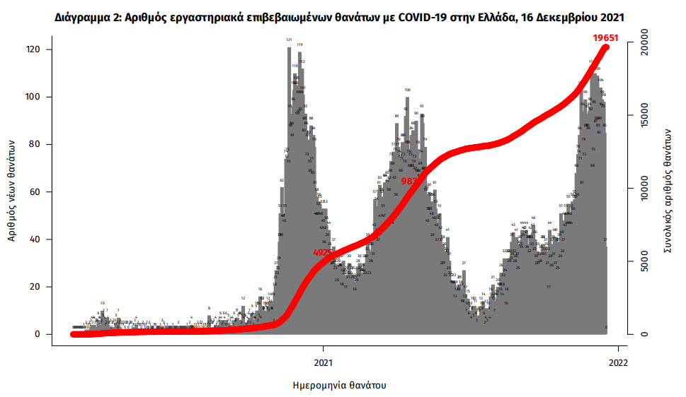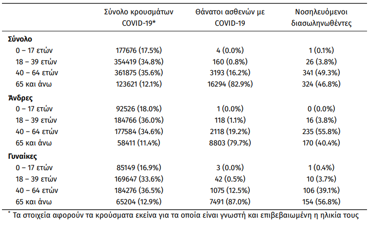 Οι νέοι θάνατοι ασθενών με COVID-19 είναι 96, ενώ από την έναρξη της επιδημίας έχουν καταγραφεί συνολικά 19.651 θάνατοι. Το 95.3% είχε υποκείμενο νόσημα ή/και ηλικία 70 ετών και άνω.