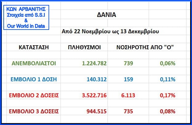 Ο Κ.Αρβανίτης χρησιμοποιεί τα στοιχεία από τη Δανία και καταλήγει στο συμπέρασμα ότι «την χαμηλότερη νοσηρότητα εμφάνισαν οι ανεμβολίαστοι», αντιθέτως «οι διπλοεμβολιασμένοι έχουν σχεδόν τριπλάσια νοσηρότητα από τους ανεμβολίαστους».