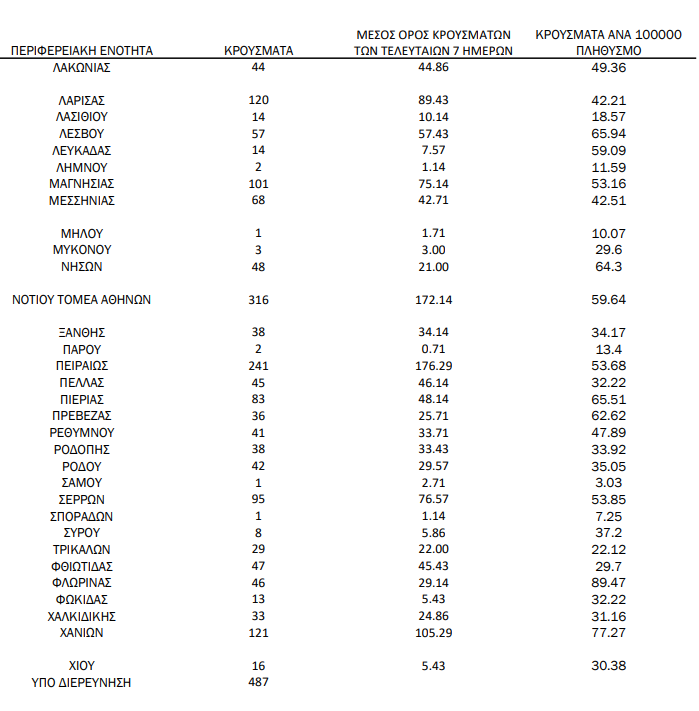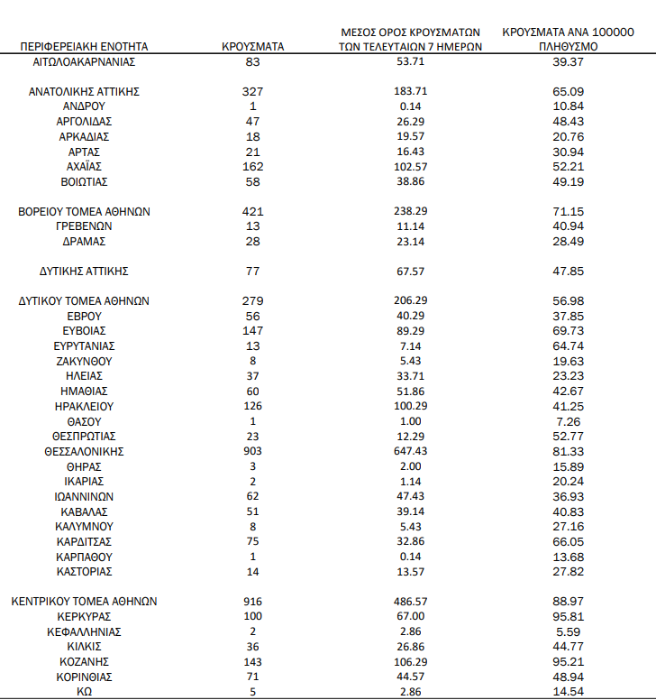 Με βάση τα επιβεβαιωμένα κρούσματα των τελευταίων 7 ημερών, 196 θεωρούνται σχετιζόμενα με ταξίδι από το εξωτερικό και 2.739 είναι σχετιζόμενα με ήδη γνωστό κρούσμα.