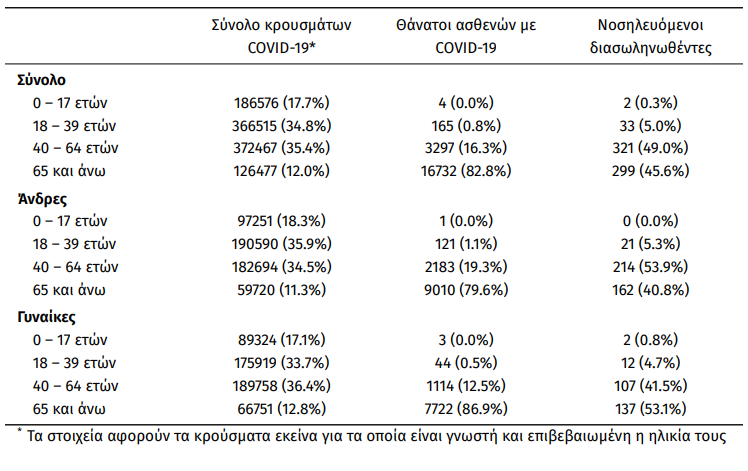 Οι νέοι θάνατοι ασθενών με COVID-19 είναι 71, ενώ από την έναρξη της επιδημίας έχουν καταγραφεί συνολικά 20.198 θάνατοι. Το 95.2% είχε υποκείμενο νόσημα ή/και ηλικία 70 ετών και άνω.
