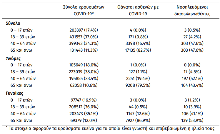 Οι νέοι θάνατοι ασθενών με COVID-19 είναι 72, ενώ από την έναρξη της επιδημίας έχουν καταγραφεί συνολικά 20.708 θάνατοι. Το 95.2% είχε υποκείμενο νόσημα ή/και ηλικία 70 ετών και άνω.
