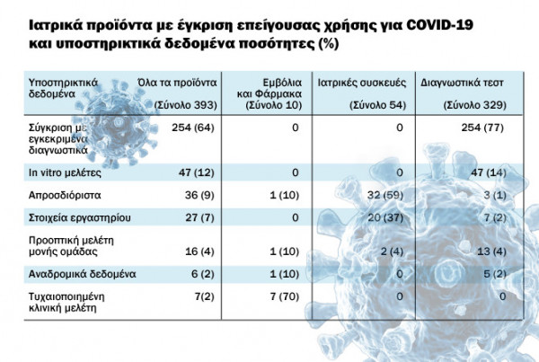 Από τα 54 ιατροτεχνολογικά προϊόντα που πήραν άδεια επείγουσας χρήσης, τα 32 από αυτά (59%), δεν κατέθεσαν συγκεκριμένα αποδεικτικά δεδομένα για τα αποτελέσματα της χρήσης τους, ενώ τα 20 από αυτά ή το 37% των αιτήσεων ιατροτεχνολογικών προϊόντων, παρουσίασαν εργαστηριακά δεδομένα.