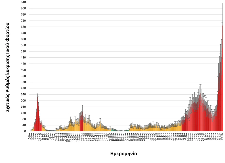 Όπως φαίνεται στα διαγράμματα που παρουσιάζει το ΑΠΕ-ΜΠΕ (επισυνάπτονται), έπειτα από δύο ημέρες που παρατηρήθηκαν ενδείξεις επιβράδυνσης της εκρηκτικής ανόδου του ιικού φορτίου, ακολούθησε νέα αύξησή του σε σημαντικά υψηλότερο επίπεδο.