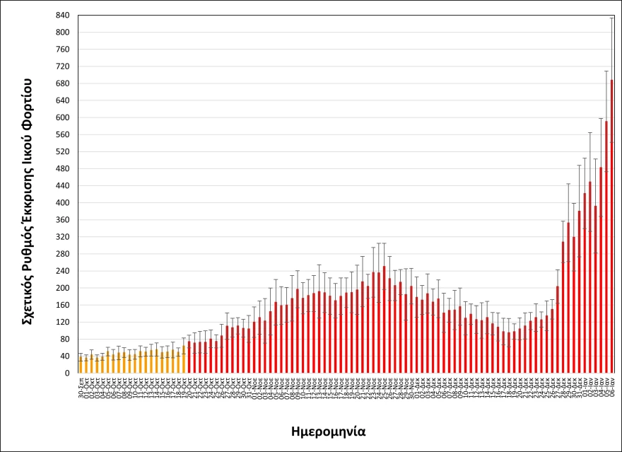Όπως φαίνεται στα διαγράμματα που παρουσιάζει το ΑΠΕ-ΜΠΕ (επισυνάπτονται), έπειτα από δύο ημέρες που παρατηρήθηκαν ενδείξεις επιβράδυνσης της εκρηκτικής ανόδου του ιικού φορτίου, ακολούθησε νέα αύξησή του σε σημαντικά υψηλότερο επίπεδο.