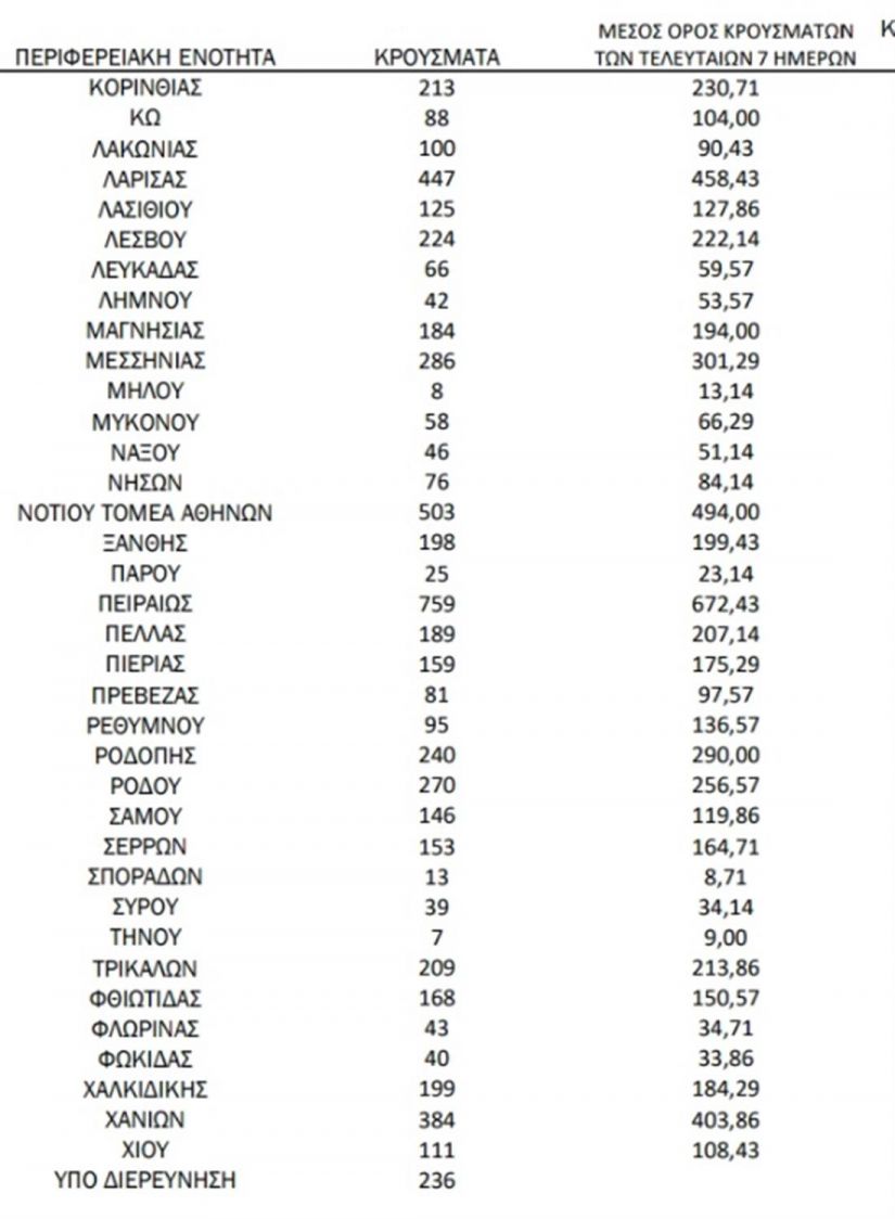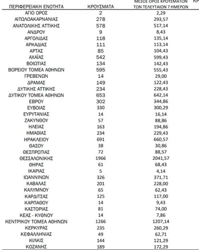 Ο συνολικός αριθμός των κρουσμάτων ανέρχεται σε 2.163.240 (ημερήσια μεταβολή +0.8%), εκ των οποίων 49.7% άνδρες. Με βάση τα επιβεβαιωμένα κρούσματα των τελευταίων 7 ημερών, 390 θεωρούνται σχετιζόμενα με ταξίδι από το εξωτερικό και 2.658 είναι σχετιζόμενα με ήδη γνωστό κρούσμα.