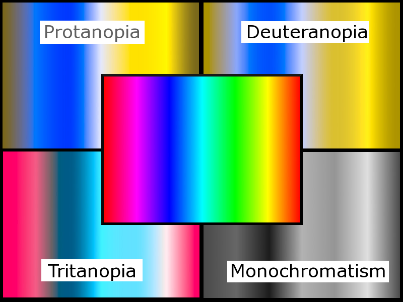 Οι τρεις κατηγορίες προβλήματος όρασης που προκύπτουν είναι η μειωμένη ευαισθησία στο κόκκινο φως (πρωτανωπία – protanomaly), η μειωμένη ευαισθησία στο πράσινο φως (δευτερανωπία – deuteranomaly), που είναι και η πιο κοινή μορφή αχρωματοψίας, και η μειωμένη ευαισθησία στο μπλε φως (τριτανωπία – tritanomaly), η οποία είναι και η πιο σπάνια από τις τρεις.