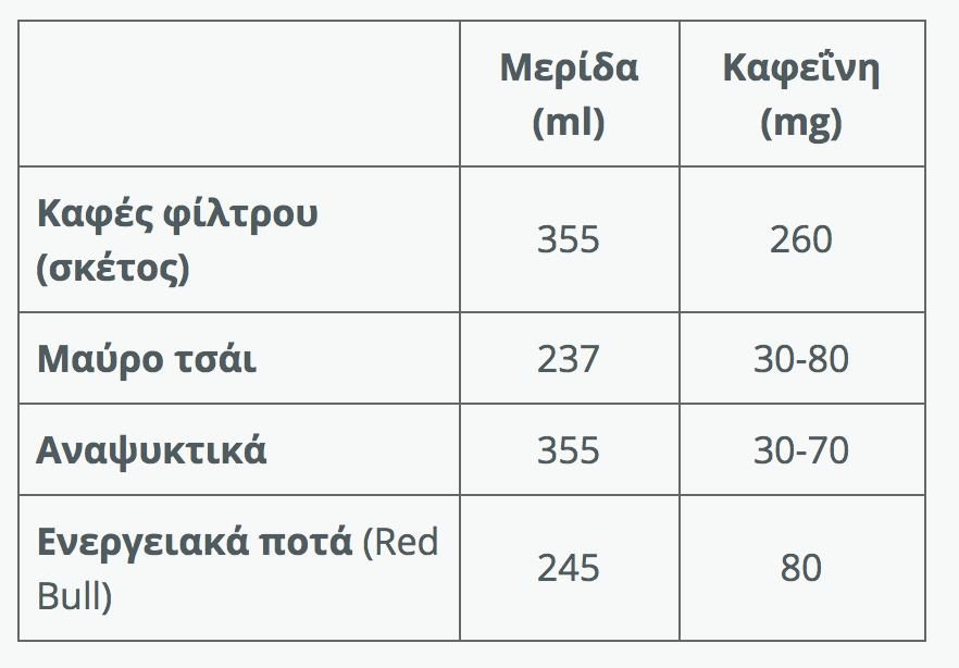 Καφές – Τυπικά, η καφεΐνη θεωρείται φάρμακο και μερικά από τα πιο δημοφιλή ποτά και ροφήματα, όπως ο καφές, το τσάι και τα αναψυκτικά, περιέχουν σημαντικές ποσότητες καφεΐνης.
