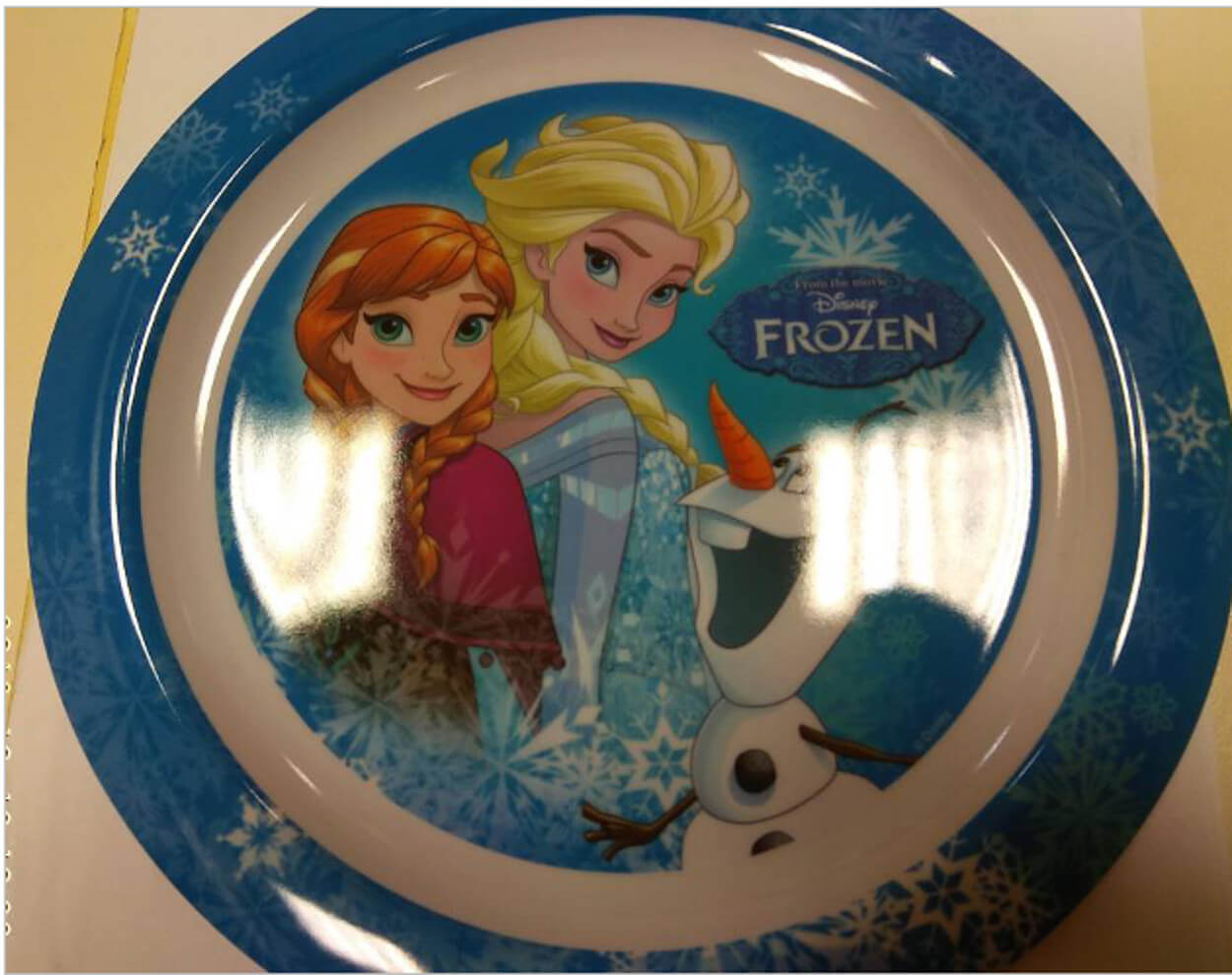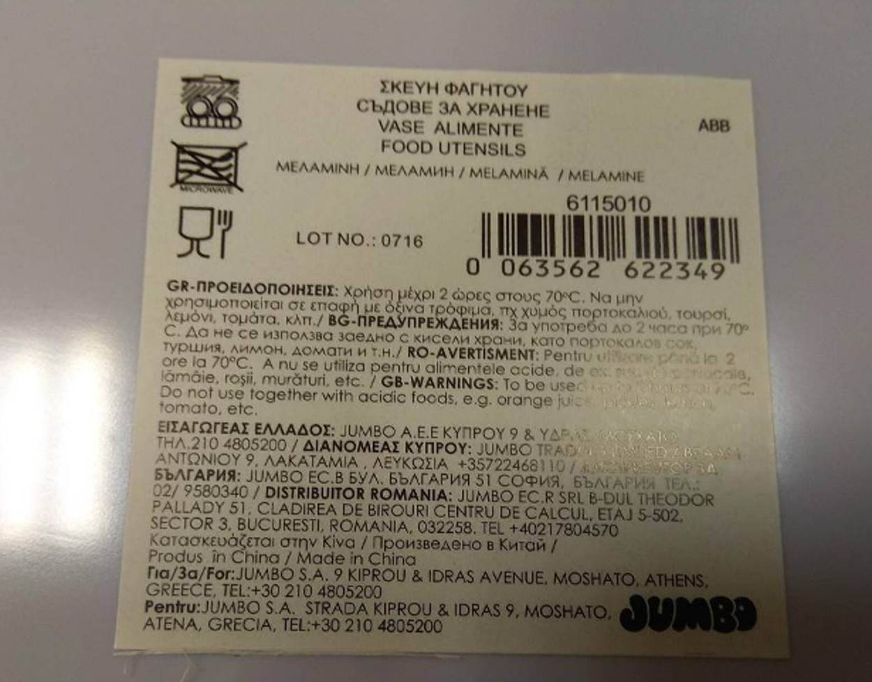 Συγκεκριμένα, όπως τονίζει ο ΕΦΕΤ διενεργήθηκε δειγματοληψία ρηχού πιάτου μελαμίνης με σχέδιο από την ταινία Frozen, με αριθμό παρτίδας Lot No 0716 και κωδικό είδους (Item No) 6115010, το οποίο κατασκευάζεται στην Κίνα, εισάγεται, διανέμεται και πωλείται από την επιχείρηση Jumbo ΑΕΕ.