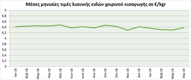 Σύμφωνα με τα στοιχεία του Παρατηρητηρίου Τιμών της Γενικής Γραμματείας Εμπορίου και Προστασίας Καταναλωτή του Υπουργείου Οικονομίας και Ανάπτυξης, οι τιμές χοιρινού κρέατος εισαγωγής είναι μάλλον σταθερές. Στο παρακάτω διάγραμμα εμφανίζονται οι μέσες μηνιαίες τιμές χοιρινού λιανικής από τον Ιαν. 2018 έως και τον Απρ. 2019. Το ελάχιστο περιόδου παρατηρήθηκε τον Νοέμβριο 2018 (4,29 €/kgr) και το μέγιστο το Μάιο 2018 (4,48 €/kgr) με μέσο όρο περιόδου στα 4,40 €/kgr.