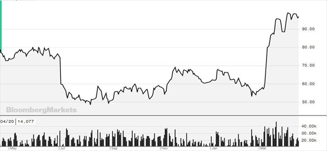 Όπως επισημαίνει το υπουργείο, οι τιμές εκκαθάρισης των συμβολαίων μελλοντικής εκπλήρωσης για ζώντα χοιρινά στο χρηματιστήριο αγαθών του Σικάγο (CME) αυξήθηκαν κατά 77,5% (από 53,9 $/lb στις 25/2/19 σε 95,68 $/lb στις 22/3/2019), ενώ στις 18/4/19 η τιμή εκκαθάρισης ήταν στα 96,75 $/lb, που αποτελεί υψηλό τετραετιάς από το Σεπτέβριο 2014. Αξίζει, όμως να σημειωθεί ότι κατά το τελευταίο έτος (20/4/18 – 18/4/19) η τάση δεν ήταν συνεχώς αυξητική στο εν λόγω χρηματιστήριο, το αντίθετο. Στο παρακάτω διάγραμμα εμφανίζονται οι τιμές εκκαθάρισης για ζώντα χοιρινά στο CME κατά το τελευταίο έτος, όπου εμφανίζεται η χαμηλότερη τιμή στις 25/2/2019 (53,90 $/lb).