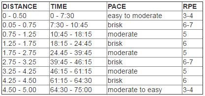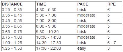 Χρησιμοποιήστε ένα βηματόμετρο (αν έχετε), για να παρακολουθείτε την απόσταση που διανύετε. Ρυθμίστε την ταχύτητά σας, για να πιάσετε τον στόχο με τα αρχικά “RPE” που θα δείτε στους παρακάτω πίνακες. Αυτά τα αρχικά είναι “Rate of Perceived Exertion” και περιγράφει έναν αριθμό στην κλίμακα της προσπάθειας που πρέπει να καταβάλετε κάθε φορά.