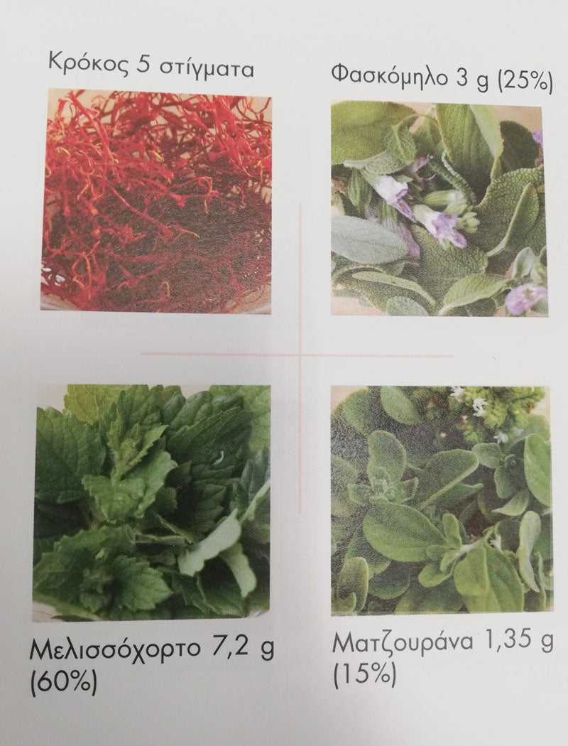 Συνδυάστε κρόκο, φασκόμηλο, μελισσόχορτο και ματζουράνα και απολαύστε ένα μείγμα που βοηθά στη χαλάρωση. Τα συστατικά του ανακουφίζουν από τα ήπια συμπτώματα του ψυχικού στρες αλλά και από ήπιες γαστρεντερικές ενοχλήσεις.
