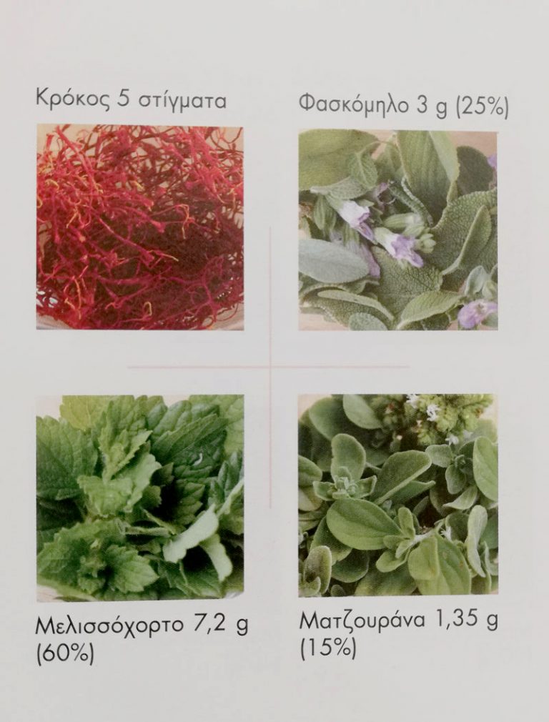 Συνδυάστε 5 στίγματα κρόκου, 3 γραμμάρια (25%) φασκόμηλο, 7,2 γραμμάρια (60%) μελισσόχορτο και 1,35 γραμμάρια (15%) μαντζουράνα και απολαύστε ένα έγχυμα παρασκευάζεται σε μόλις 3 λεπτά (12 γραμμάρια δρόγης για 4 άτομα) και είναι αυτό ακριβώς που χρειάζεστε.