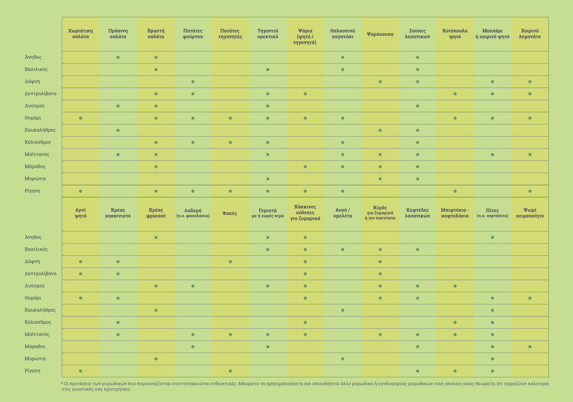 Στον ακόλουθο πίνακα θα βρείτε προτάσεις της Λέσχης Αρχιμαγείρων Ελλάδας για μυρωδικά που μπορούν να χρησιμοποιηθούν αντί του αλατιού σε μερικά από τα πιο συνήθη φαγητά που γεμίζουν το ελληνικό τραπέζι.