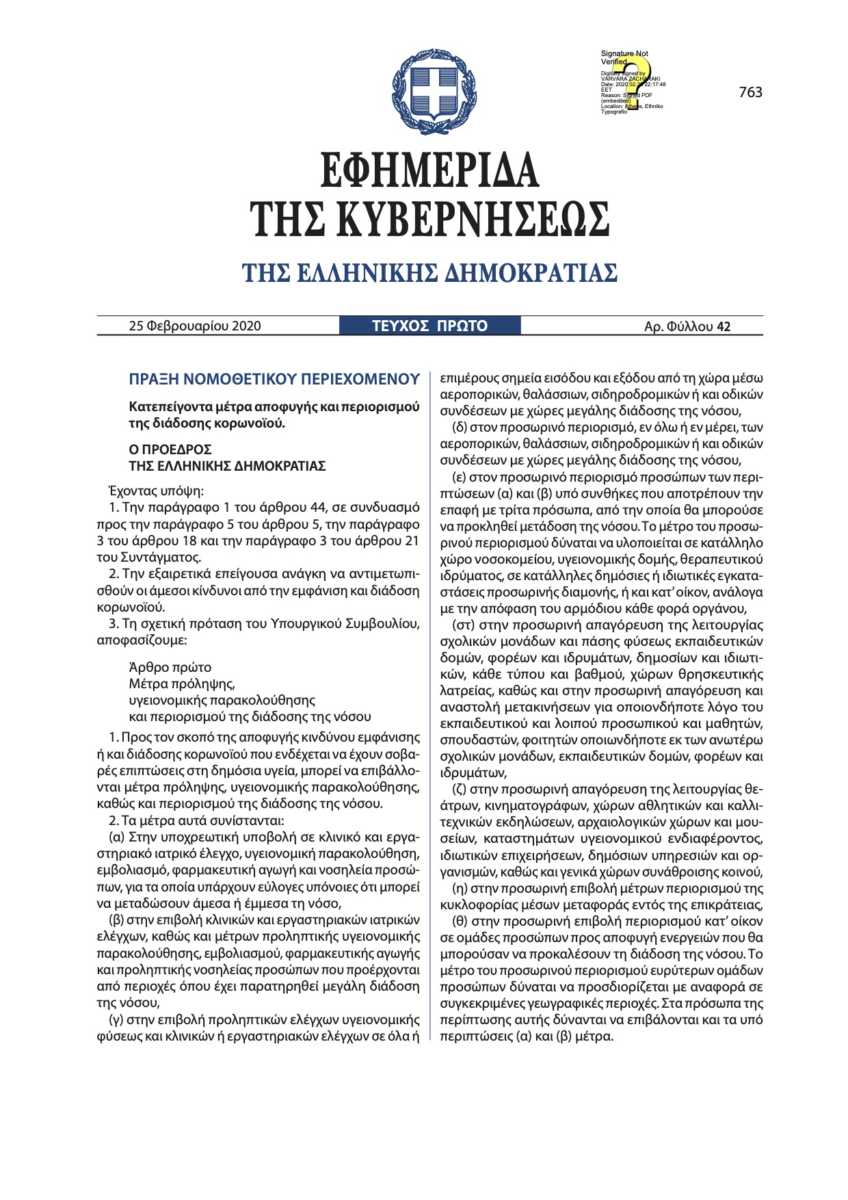 Δημοσιεύθηκε στην Εφημερίδα της Κυβερνήσεως η Πράξη Νομοθετικού Περιεχομένου που περιέχει τα μέτρα αποφυγής και διάδοσης του κορονοϊού. Τα μέτρα όπως δήλωσε και ο κυβερνητικός εκπρόσωπος θα ενεργοποιηθούν όταν θα χρειαστεί.
