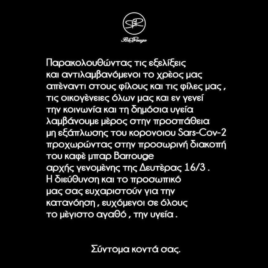 «Παρακολουθώντας τις εξελίξεις και αντιλαμβανόμενοι το χρέος μας απέναντι στους φίλους μας και τις φίλες μας, τις οικογένειες όλων μας και εν γένει την δημόσια υγεία, λαμβάνουμε μέρος στην προσπάθεια μη εξάπλωσης του κορωνοϊού προχωρώντας στην προσωρινή διακοπή του καφέ μπαρ Barrouge αρχής γενομένης της Δευτέρας 16/03. Η διεύθυνση και το προσωπικό, σας ευχαριστούν για την κατανόηση, ευχόμενο σε όλους το μέγιστο αγαθό, την υγεία». Με αυτή την ανακοίνωση στα μέσα κοινωνικής δικτύωσης το μπαρ στην πλατεία Προσκόπων στο Παγκράτι ανακοινώνει επίσης την αναστολή της λειτουργίας του.