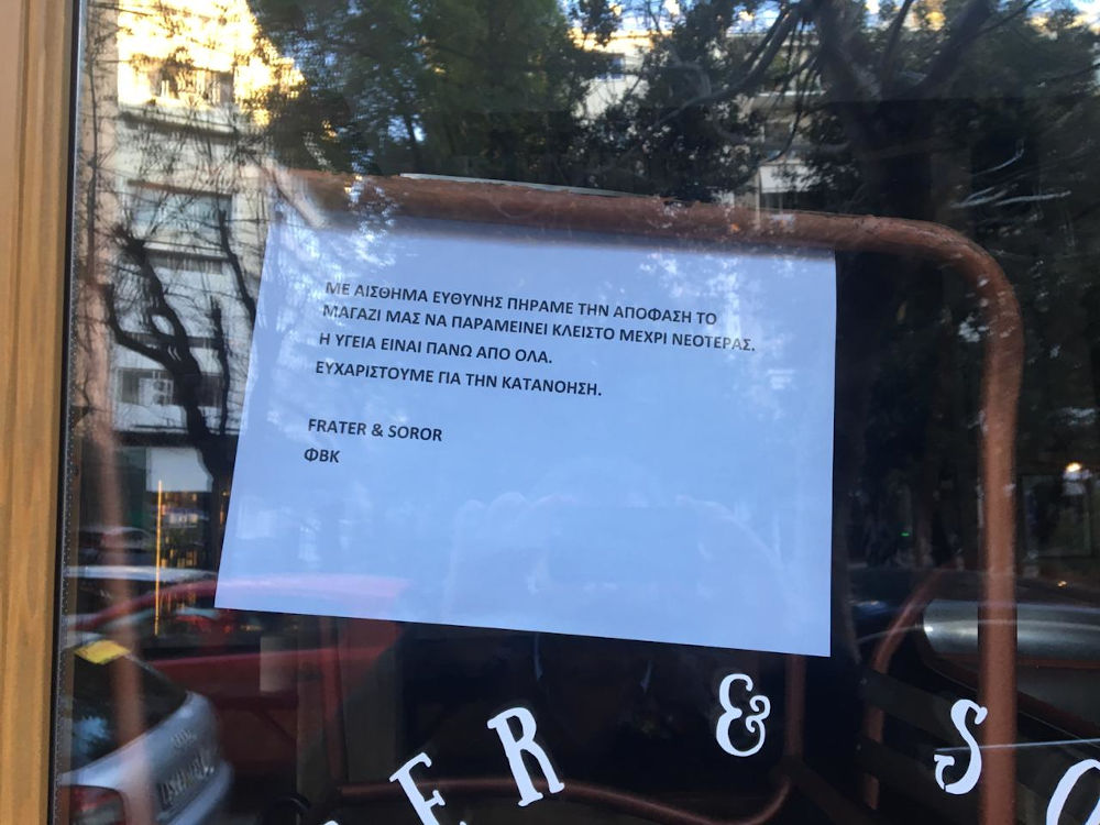«Με αίσθημα ευθύνης πήραμε την απόφαση το μαγαζί μας να παραμείνει κλειστό μέχρι νεοτέρας. Η υγεία είναι πάνω από όλα. Ευχαριστούμε για την κατανόηση» αναφέρει μπαρ στο Παγκράτι που ανέστειλε από το πρωί της Παρασκευής τη λειτουργία του.