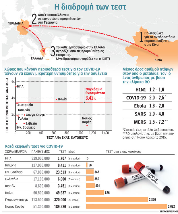 Προβλήματα στην επαρκή τροφοδοσία των μικροβιολογικών εργαστηρίων με αντιδραστήρια που απαιτούνται στην ανίχνευση του νέου κορωνοϊού –κυρίως για τα προκαταρκτικά στάδια του ελέγχου– καταγράφονται στα εργαστήρια της χώρας. Η παραγωγή της πρώτης ύλης γίνεται στην Κίνα, η οποία την αποστέλλει σε εργοστάσια προμηθευτών στη Γερμανία. Τα εργαστήρια της χώρας μας αγοράζουν τα αντιδραστήρια από τους προμηθευτές, ωστόσο οι ποσότητες που διατίθενται είναι πολύ μικρές λόγω μεγάλης ζήτησης. Οι υπεύθυνοι των εργαστηρίων βρίσκονται σε διαρκή επικοινωνία με προμηθευτές σε μία προσπάθεια για την ομαλοποίηση της κατάστασης.