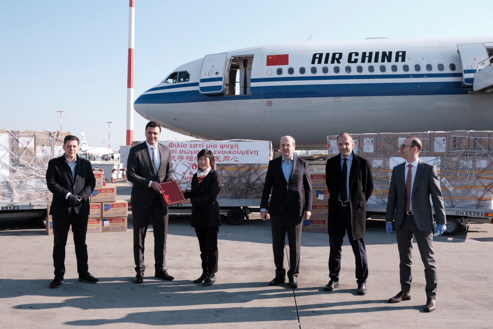 Η Πρέσβης της Κίνας στην Ελλάδα, κ. Zhang Qiyue, παρέδωσε τις ιατρικές προμήθειες εκ μέρους της κινεζικής κυβέρνησης στον υπουργό Υγείας κ. Βασίλη Κικίλια στον Διεθνή Αερολιμένα Αθηνών, Ελευθέριος Βενιζέλος. Ο Υπουργός Επικρατείας κ. Γιώργος Γεραπετρίτης και ο Αναπληρωτής Υπουργός Εξωτερικών για τις Ευρωπαϊκές Υποθέσεις Μιλτιάδης Βαρβιτσιώτης ήταν παρόντες στην εκδήλωση παραλαβής της βοήθειας.