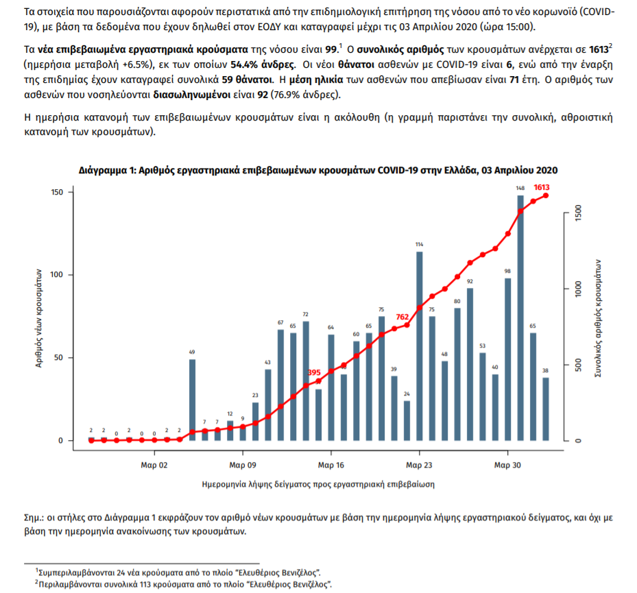 Τα στοιχεία που δημοσιεύονται στην (υποτίθεται ημερήσια αν και είχε να δημοσιευτεί από τις 29 Μαρτίου) έκθεση του ΕΟΔΥ δείχνουν μία σαφή εικόνα για την εξέλιξη της επιδημίας στη χώρα.