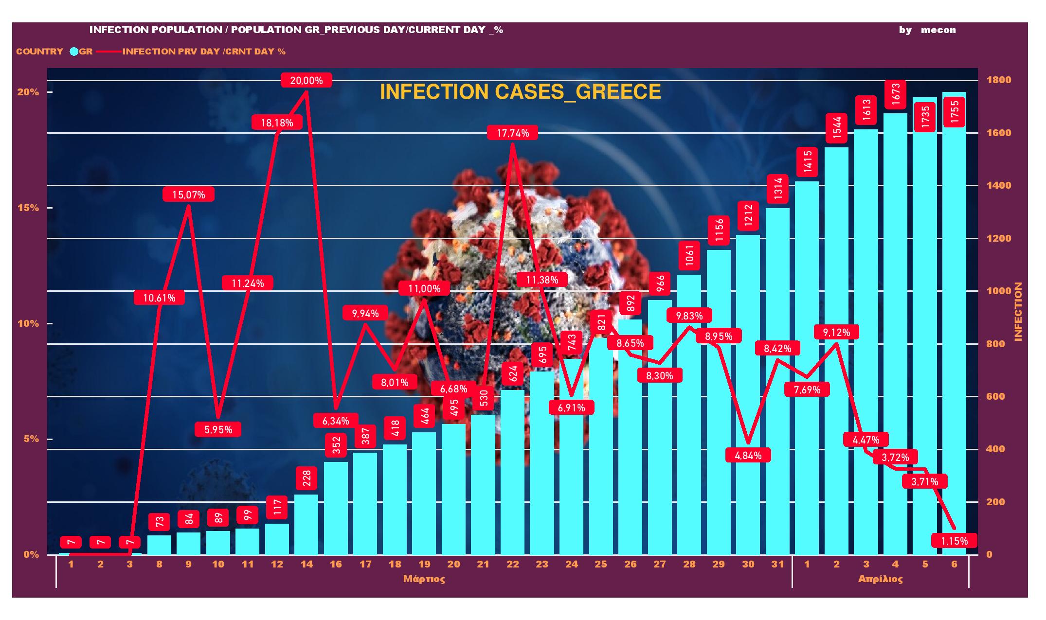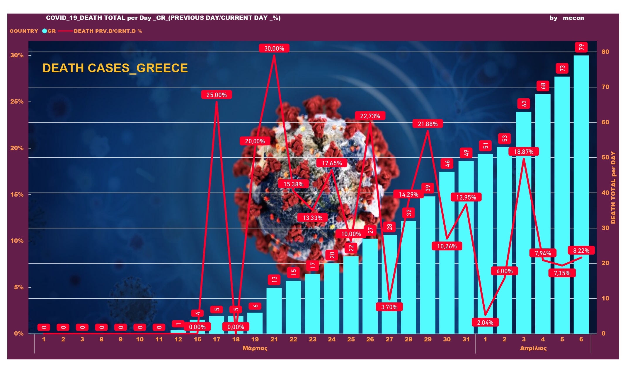Στο πρώτο διάγραμμα (κάτω) φαίνεται η διαγραμματική απεικόνιση από τον πρώτο θάνατο ασθενούς από κορωνοϊό στην Ελλάδα μέχρι χθες. Η γενική εικόνα είναι ότι η επιδημία έχει κορυφώσει.