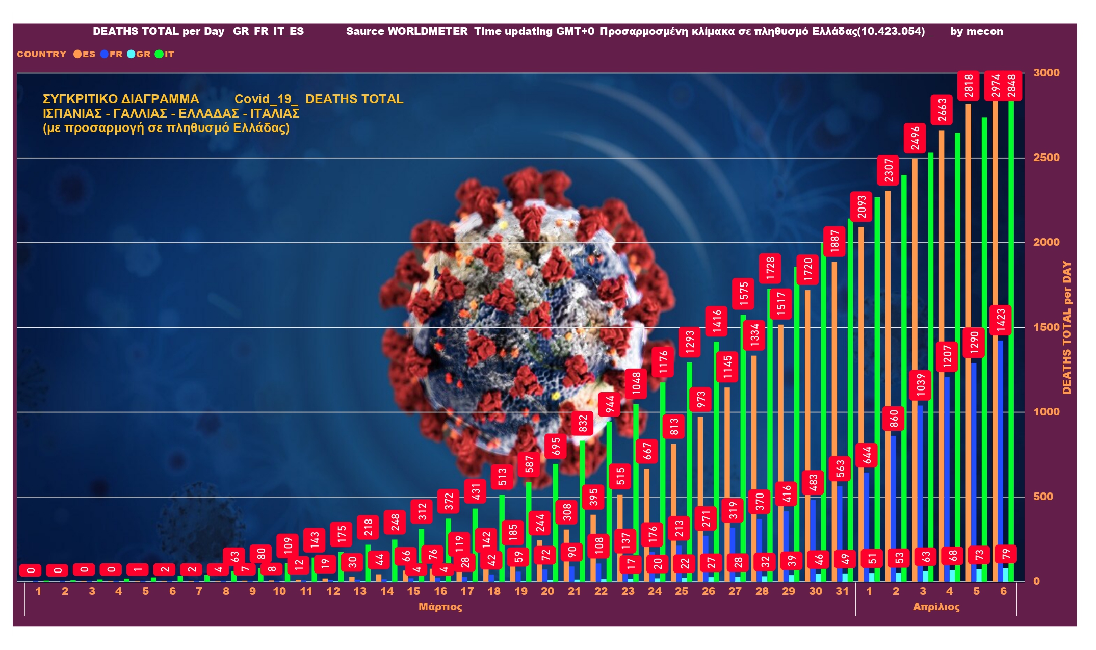 Το παρακάτω διάγραμμα θανάτων Ελλάδας – Ισπανίας – Γαλλίας – Ιταλίας έως και 6/4/2020, επιβεβαιώνει την προηγούμενη καρτέλα: Οι θάνατοι είναι υπερπολλαπλάσιοι στις άλλες τρεις χώρες, ανεξάρτητα αν αυτές πήραν μέτρα πολλές ημέρες πριν από την Ελλάδα