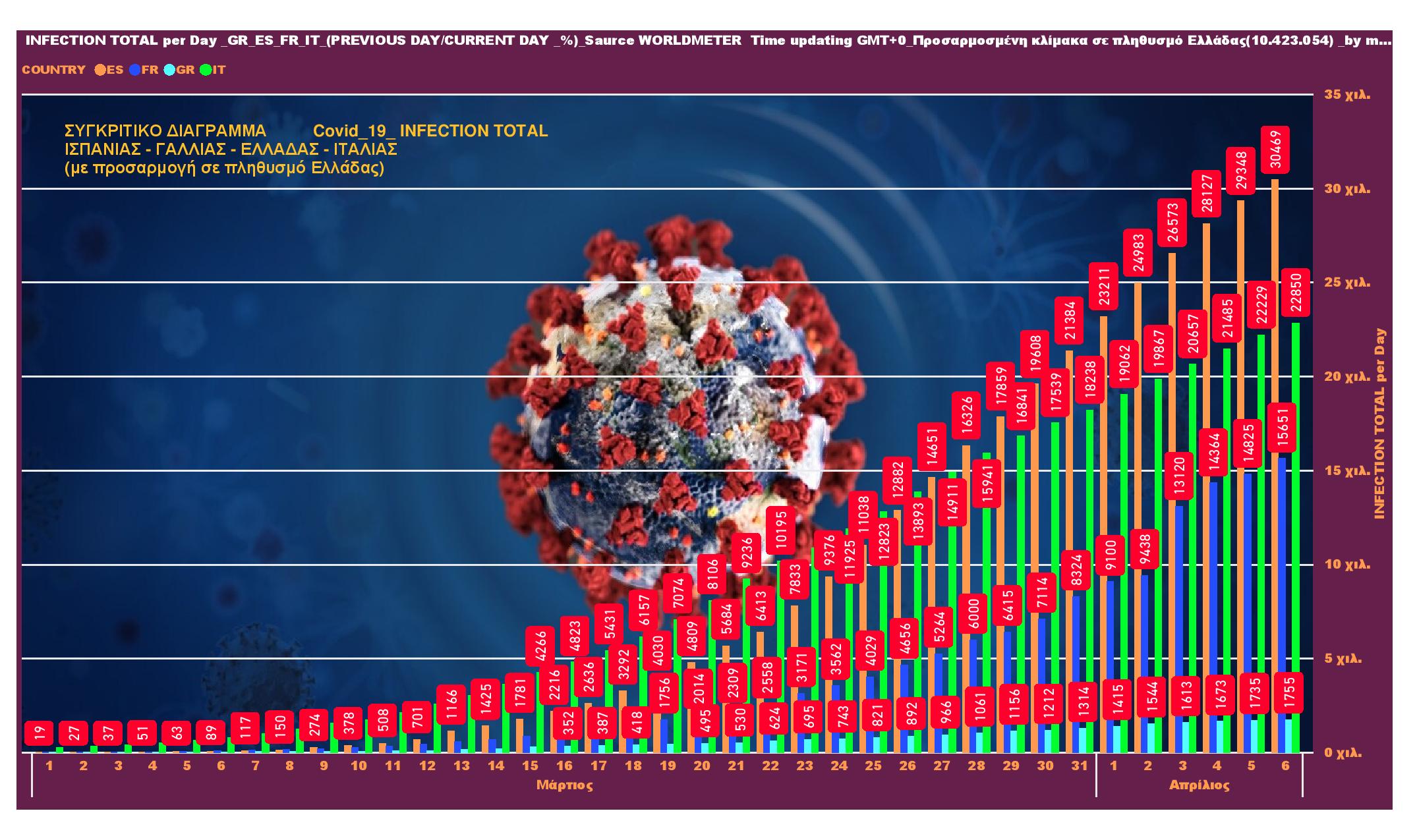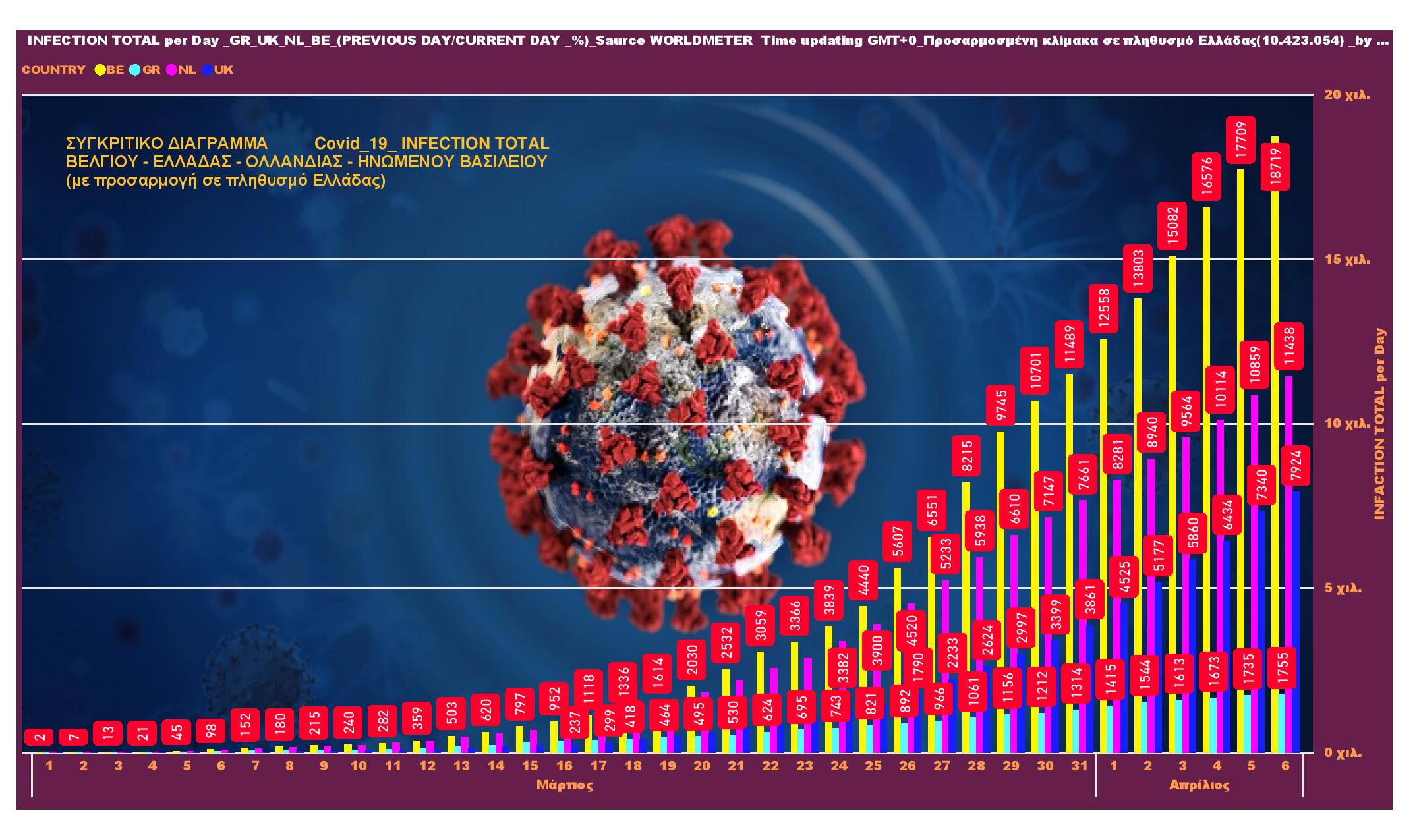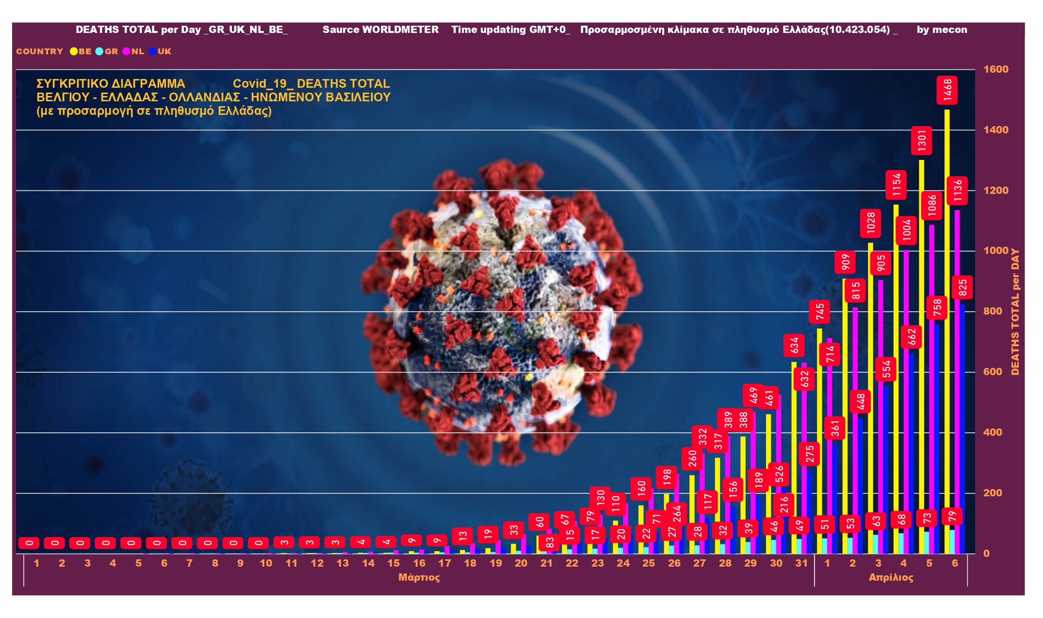 Το παρακάτω διάγραμμα δείχνει το σύνολο των θανάτων με πληθυσμιακή προσαρμογή πληθυσμού Ελλάδας – Ην.Βασιλείου – Ολλανδίας – Βέλγιου έως και 6/4/2020.