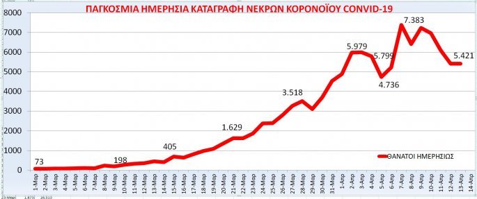 Μεγάλη μείωση όμως έχουμε και στα θύματα. Από το αρνητικό ρεκόρ των 6.973 νεκρών της 10ης Απριλίου έχουμε σταδιακή αποκλιμάκωση και μείωση θυμάτων. Ετσι φτάσαμε στους 5.421 νεκρούς το 24ωρο της 13ης Απριλίου. Πρόκειται για μείωση 22,2% μέσα σε τρεις ημέρες.
