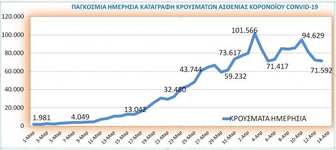 Αισιόδοξο μήνυμα ως προς το μέλλον και την διάρκεια της πανδημίας εκφράζουν για τέσσερις συνεχόμενες ημέρες τα συγκεντρωτικά νούμερα καταγραφής των ασθενών αλλά και των νεκρών από τον κορωνοϊό. Την 10η Απριλίου καταγράφηκαν παγκοσμίως 94.629 νέα κρούσματα μέσα σε μία ημέρα αλλά από τότε για τρεις ημέρες υπάρχει μεγάλη μείωση που φτάνει το 24,3% καθώς τα μεσάνυχτα της 14η Απριλίου καταγράφηκαν 71.592 νέα κρούσματα μέσα στο 24ωρο της 13ης Απριλίου.