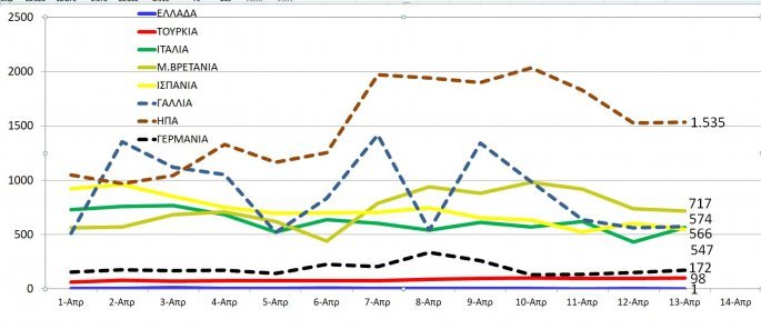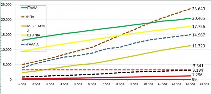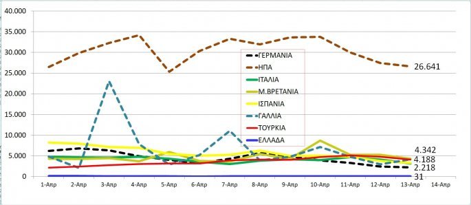 Οι ΗΠΑ, η Ιταλία και η Ισπανία έχουν τους περισσότερους νεκρούς από την πανδημία ωστόσο ανησυχία υπάρχει στη Γερμανία καθώς για τέταρτο 24ωρο σημειώθηκε αύξηση στον αριθμό των νεκρών. Σε πενταψήφια νούμερα κινείται πλέον και η Μ.Βρετανία.