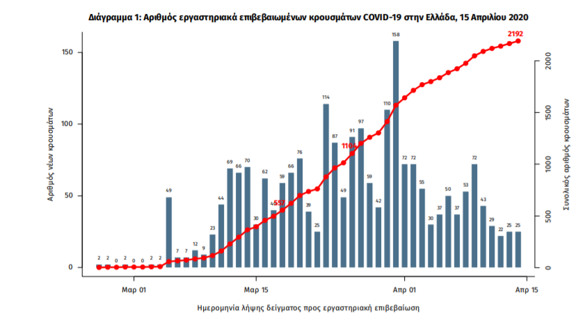 Όπως βλέπουμε και στο διάγραμμα, πέρα από κάποιες εξάρσεις που οφείλονται κυρίως σε μαζικές εστίες κρουσμάτων (πλοίο Ελ.Βενιζέλος, Έλληνες του εξωτερικού κτλπ) η καμπύλη έχει παραμείνει σταθερή από την αρχή της επιδημίας, ενώ τις τελευταίες ημέρες παρουσιάζει και πτώση.