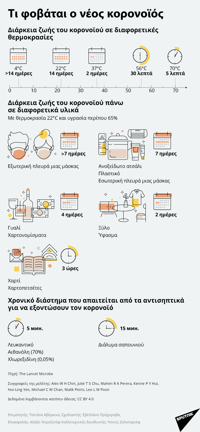 Ο κορωνοϊός παρουσιάζει διαφορετική διάρκεια ζωής ανάλογα με τη θερμοκρασία και την επιφάνεια πάνω στην οποία βρίσκεται.
