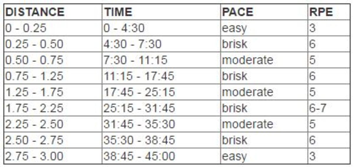 Χρησιμοποιήστε ένα βηματόμετρο (αν έχετε), για να παρακολουθείτε την απόσταση που διανύετε. Ρυθμίστε την ταχύτητά σας, για να πιάσετε τον στόχο με τα αρχικά “RPE” που θα δείτε στους παρακάτω πίνακες. Αυτά τα αρχικά είναι “Rate of Perceived Exertion” και περιγράφει έναν αριθμό στην κλίμακα της προσπάθειας που πρέπει να καταβάλετε κάθε φορά.