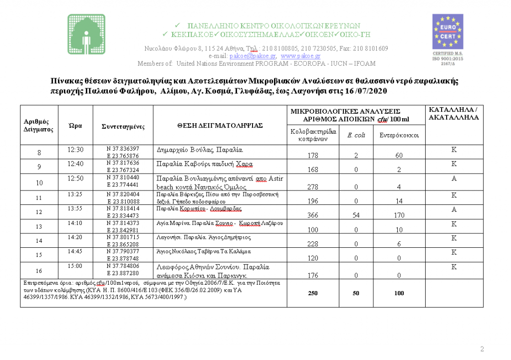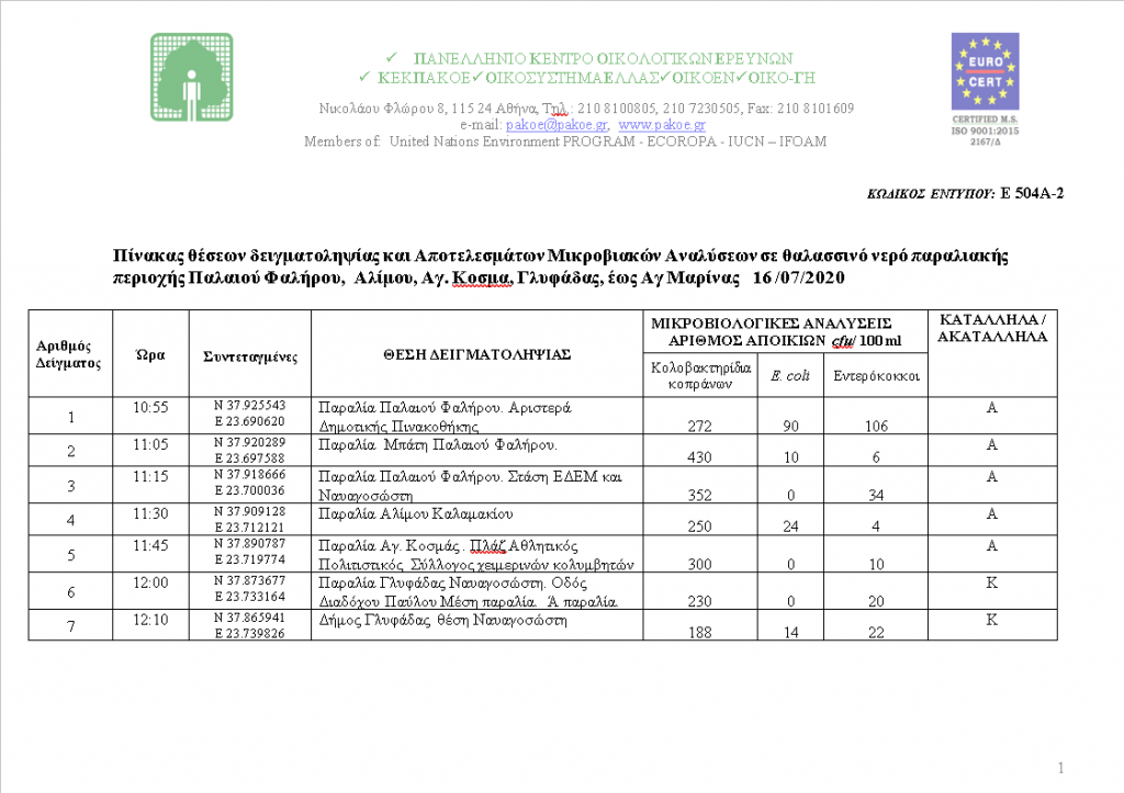 Στην επαναληπτική δειγματοληψία που έγινε στις 16/7/20 σε νερά κολύμβησης στις παρακάτω αναφερόμενες παραλίες διαπιστώθηκε ότι από τα 16 δείγματα τα 7 δηλαδή ποσοστό που αγγίζει το 45% είναι ακατάλληλα για κολύμβηση.
