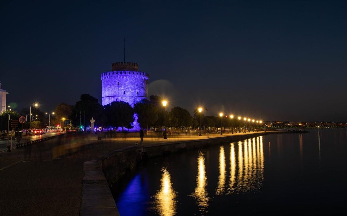 Με μπλε χρώμα φωταγωγήθηκε και ο Λευκός Πύργος στη Θεσσαλονίκη.
