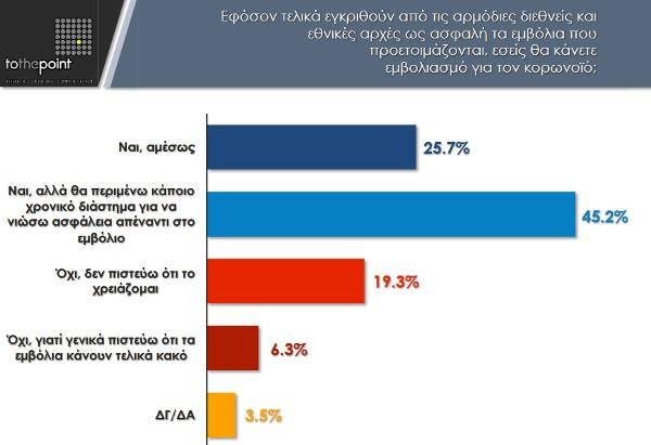 Ειδικότερα, μόνο το 25,7% του πληθυσμού δηλώνει ότι θα κάνει «άμεσα» το εμβόλιο, ενώ το 45,2% δηλώνει ότι «θα κάνει το εμβόλιο αλλά θα περιμένει για κάποιο διάστημα ώστε να διαπιστώσει ότι είναι ασφαλές».