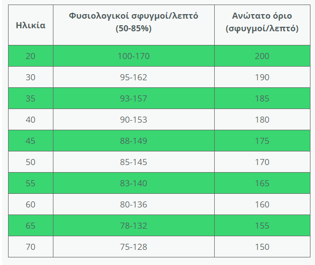 Ο επόμενος πίνακας δείχνει το φυσιολογικό και το ανώτατο όριο παλμών ανά ηλικία για τους ενήλικες. Η Αμερικανική Ένωση για την Καρδιά αναφέρει ως απόλυτο μέγιστο όριο παλμών κατά τη διάρκεια σωματικής άσκησης το [220 – ηλικία ατόμου]. Δηλαδή για ένα άτομο 40 χρόνων, το απόλυτο μέγιστο είναι [220 – 45 =] 175 παλμοί/λεπτό.
