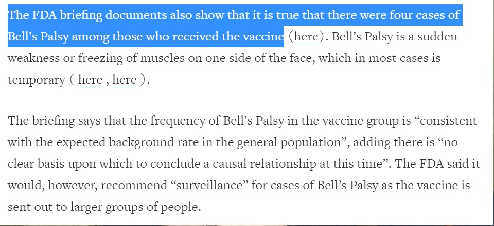 Τα έγγραφα αναφέρουν επίσης ότι η συχνότητα του Bell’s Palsy στην ομάδα του πήρε το εμβόλιο είναι “αναμενόμενη με τον ρυθμό ιστορικού του γενικού πληθυσμού”, προσθέτοντας ότι “δεν υπάρχει καθαρή βάση πάνω στην οποία να καταλήγεις σε μία αιτιώδη σχέση αυτή τη στιγμή”. Ο FDA παρόλα αυτά συστήνει “επιτήρηση” για τις περιπτώσεις εμφάνισης Bell’s Palsy όταν το εμβόλιο βγει σε μεγαλύτερο πλήθος κόσμου».