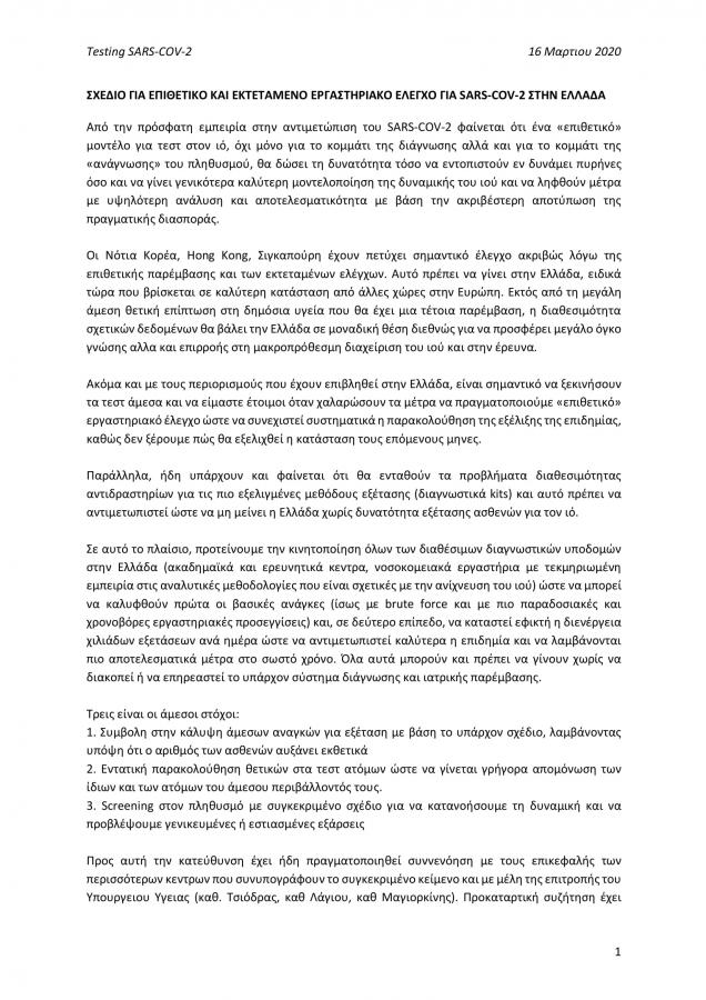 Οι καθηγητές επικαλούνταν τα ευεργετικά αποτελέσματα των εκτεταμένων ελέγχων σε χώρας όπως της Νότιας Κορέας και της Σιγκαπούρης, υπογραμμίζοντας πως μία τέτοια απόφαση, εκτός από την άμεση θετική επίπτωση στη δημόσια υγεία, «η διαθεσιμότητα σχετικών δεδομένων θα βάλει την Ελλάδα σε μοναδική θέση διεθνώς για να προσφέρει μεγάλο όγκο γνώσης αλλά και επιρροής στη μακροπρόθεσμη διαχείριση του ιού και στην έρευνα».