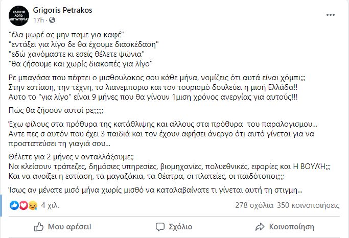 Ρε μπαγάσα που πέφτει ο μισθουλακος σου κάθε μήνα, νομίζεις ότι αυτά είναι χόμπι;;; Στην εστίαση, την τέχνη, το λιανεμποριο και τον τουρισμό δουλεύει η μισή Ελλάδα!! Αυτο το “για λίγο” είναι 9 μήνες που θα γίνουν 1μιση χρόνος ανεργίας για αυτούς!!!