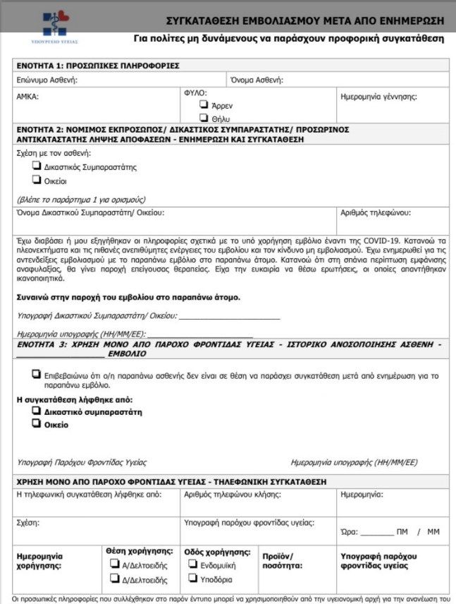 Στην περίπτωση που κάποιος πολίτης δεν μπορεί να παράσχει προφορική συγκατάθεση για το εμβόλιο, θα πρέπει να συμπληρώνεται το έγγραφο από κάποιον οικείο, πάροχο φροντίδας ή δικαστικό συμπαραστάτη.